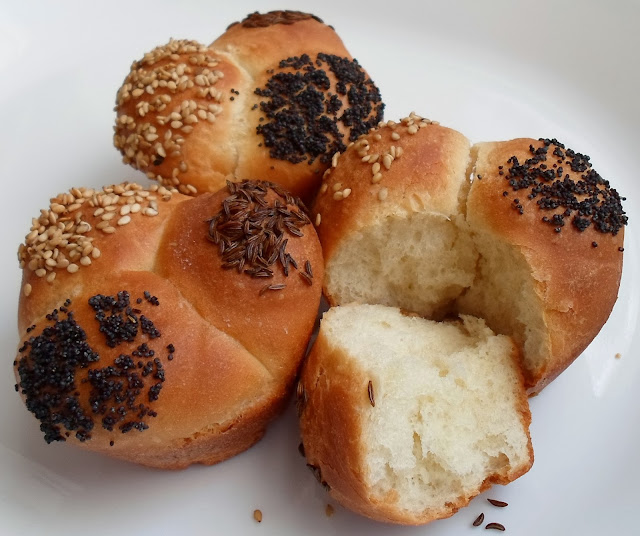 - Divide dough into 12 equal pieces, cut each piece into thirds, shape into balls and lightly coat the top with one of the washes, dip in seeds and place 3 pieces (seeds up) in each section of a greased cupcake pan. Cover and let rise until double, about 30 minutes.