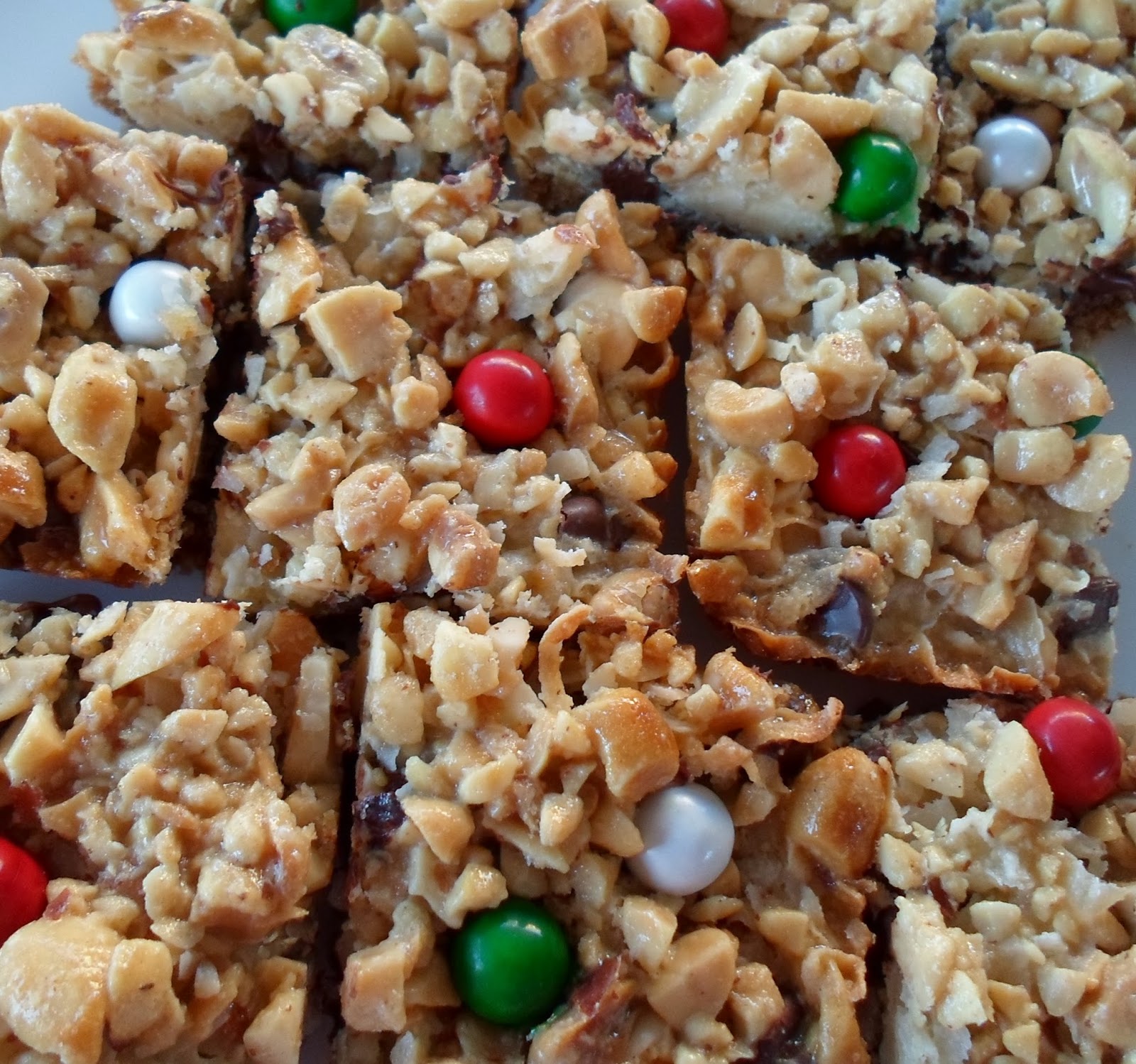 There are two very similar recipes out there, Magic Bars (or Seven Layer Magic Bars) and Hello Dollies. It seems the difference between the two is the Magic ones get the sweetened condensed milk poured over the crust and the Dollies call for pouring the milk over all the toppings. I poured it over everything, baked them and then pushed colored candy into the top. When you bake the candy (M&M's or Sixlets) it tends to crack, I think it's just prettier adding it at the end.