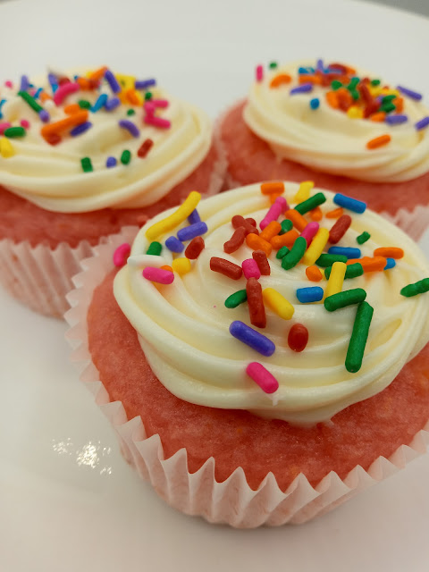 I'm not sure if I was drawn to these Strawberry Pineapple Cupcakes because of the ease of two ingredients, or because of the pretty pink color:@) But either way, we all were pleasantly surprised with how good they tasted for how simple they were to make. The pineapple keeps them moist, and adds a little chewy fruity bite. And of course a cream cheese frosting takes everything over the top. And sprinkles just makes it a party... The frosting is a little different too, it doesn't call for any butter, so I'm calling it 100% Cream Cheese Frosting. These cupcakes are great for birthdays, Easter, or... Any day.