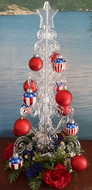 Red, White and Blue Tree. Ma gifted me this fun clear plastic tree at Christmas, look at the great scroll work and big star on top! I immediately knew I wanted to use it for the summer holidays. Ornaments are flag balls from the thrift store and Dollar Tree glitter balls. The flower ring at the base is from AC Moore many ~many~ years ago.